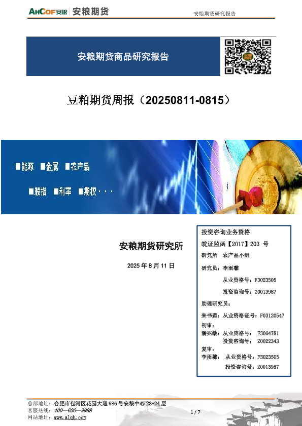 【安粮期货】【20250811】豆粕期货周报:外部供应预期收紧,进口成本支撑期价-7页