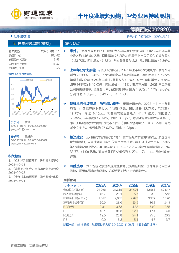 德赛西威 财务分析 汽车智能化 半年度业绩 智能驾驶