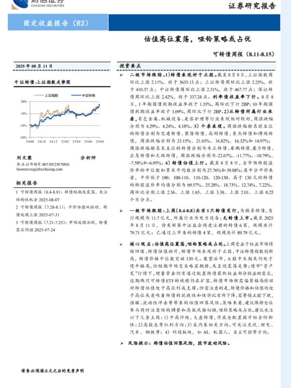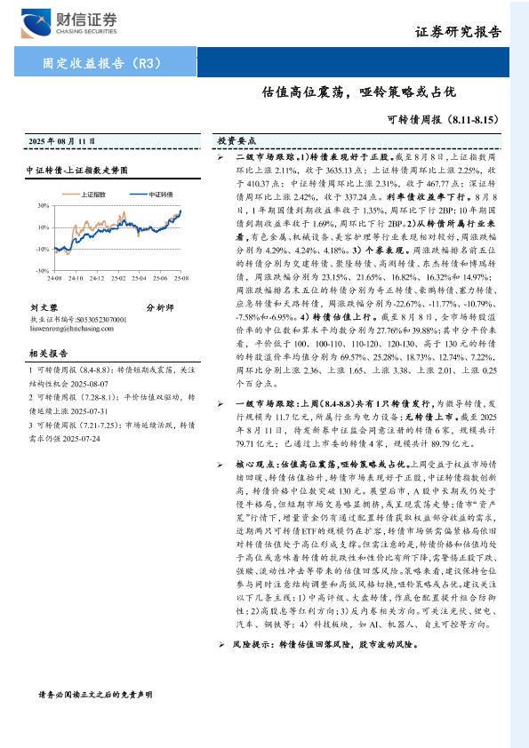 【财信证券】【20250811】财信证券-可转债周报:估值高位震荡,哑铃策略或占优-10页