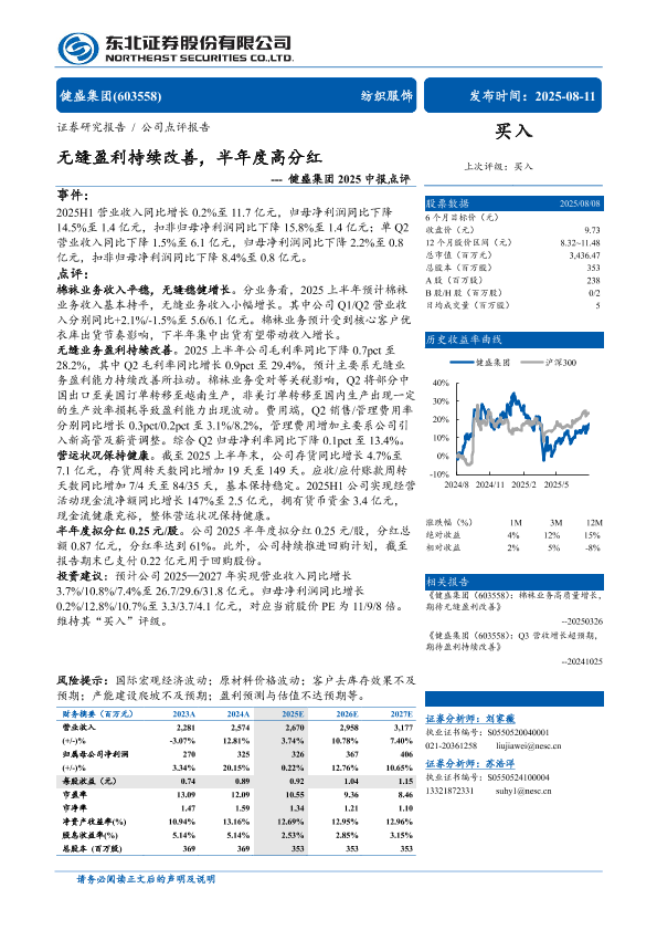 半年度报告 纺织服饰 盈利分析 高分红 健盛集团