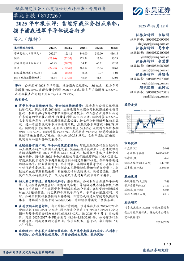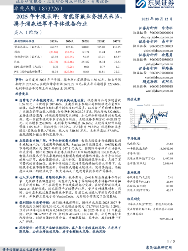 【东吴证券】【20250812】卓兆点胶-2025年中报点评:智能穿戴业务拐点来临,携手浦森进军半导体设备行业-3页