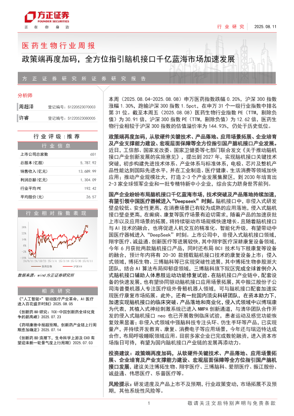 【方正证券】【20250811】医药生物行业周报:政策端再度加码,全方位指引脑机接口千亿蓝海市场加速发展-9页