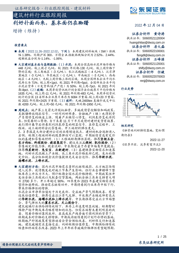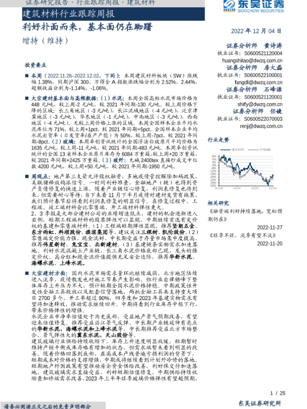 【东吴证券】【20221204】建筑材料行业跟踪周报:利好扑面而来,基本面仍在踟躇-25页