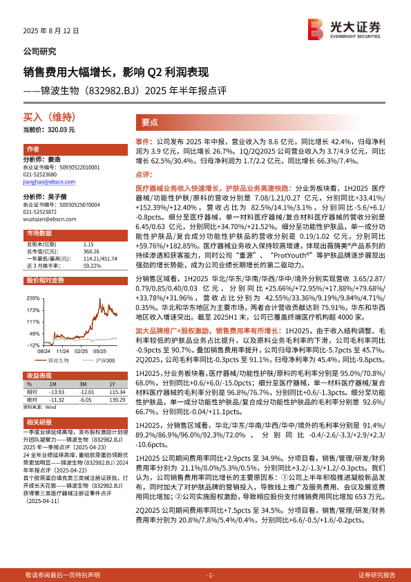 【光大证券】【20250812】锦波生物2025年半年报点评:销售费用大幅增长,影响Q2利润表现-4页