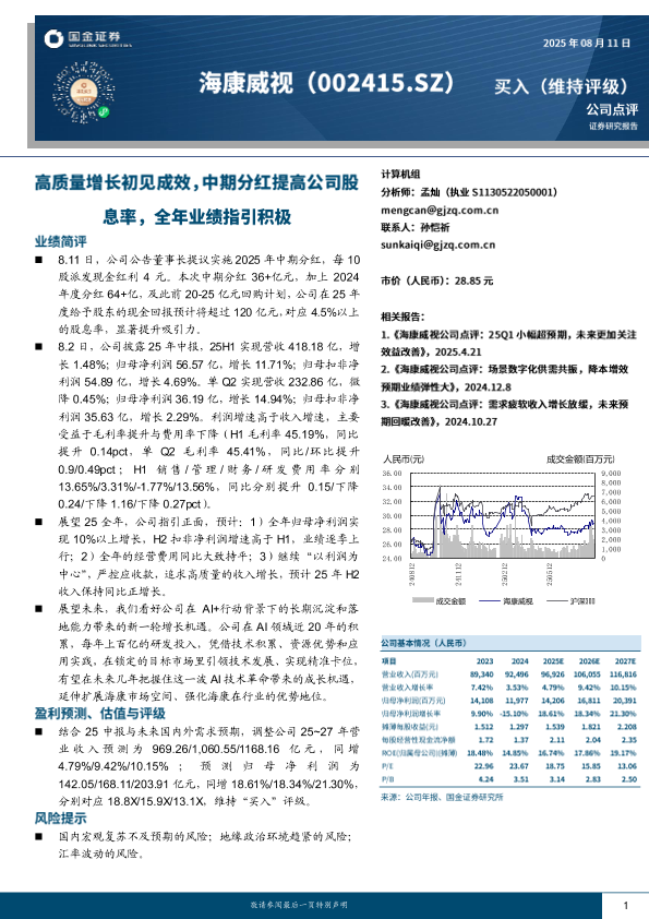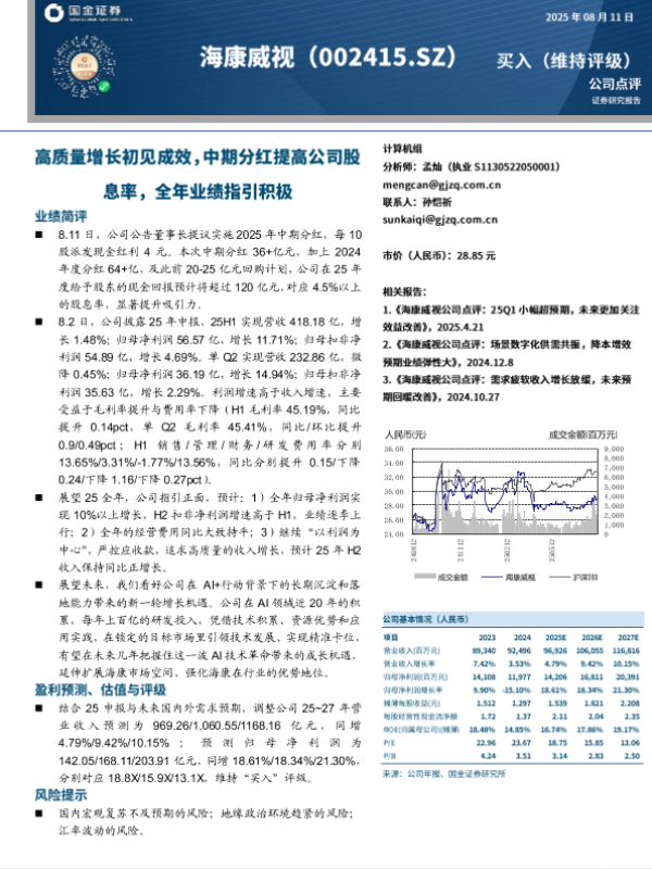 高质量增长 海康威视 业绩指引 中期分红 AI技术