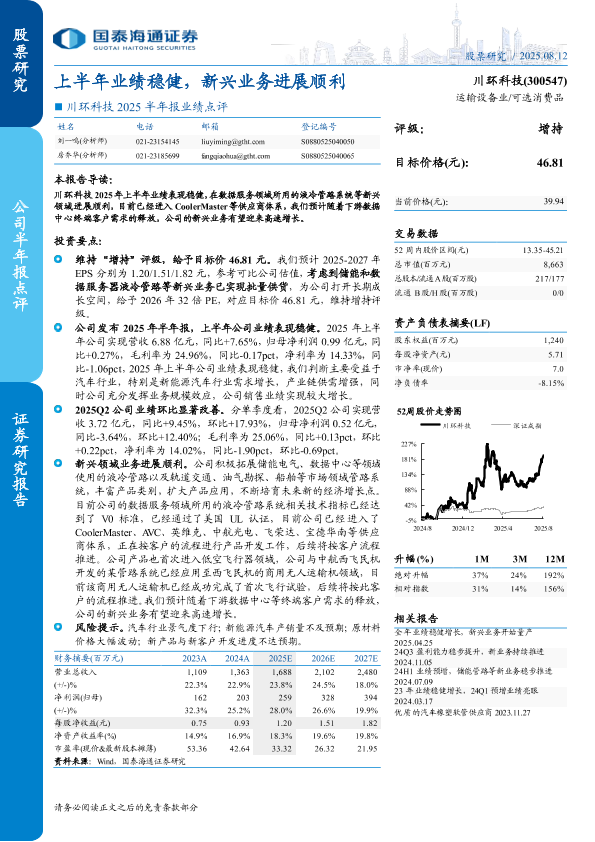 【国泰海通证券】【20250812】川环科技2025半年报业绩点评:上半年业绩稳健,新兴业务进展顺利-4页