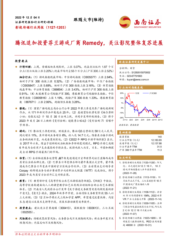 【西南证券】【20221204】影视传媒行业周报:腾讯追加投资芬兰游戏厂商Remedy,关注影院整体复苏进展-19页