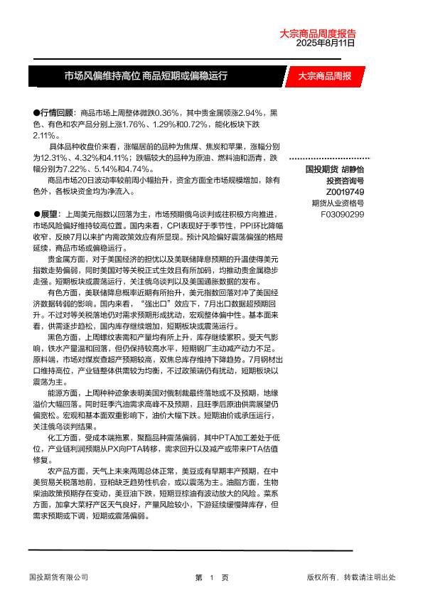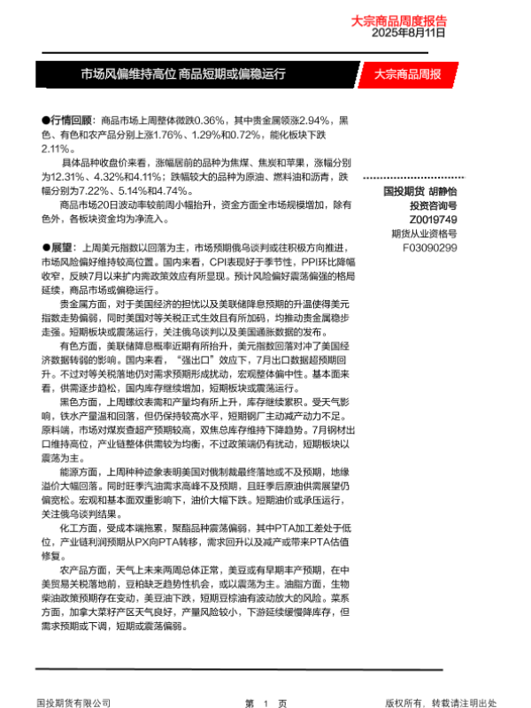 【国投期货】【20250811】大宗商品周报:市场风偏维持高位,商品短期或偏稳运行-9页