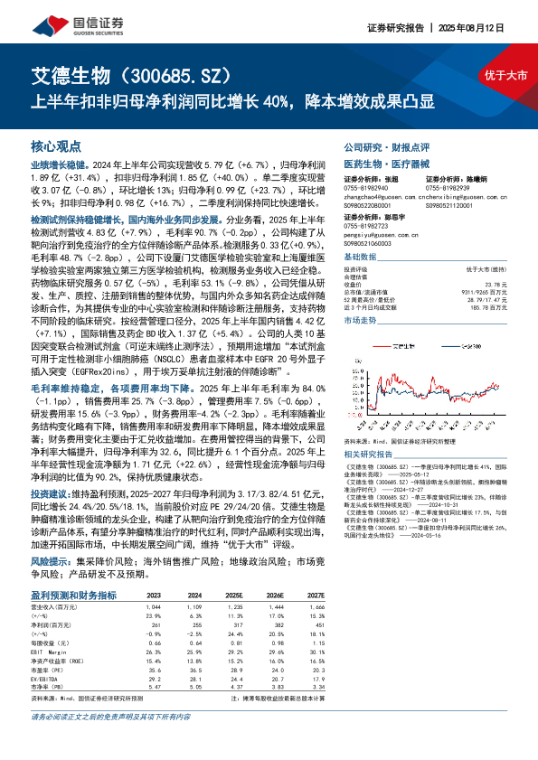 【国信证券】【20250812】艾德生物-300685-上半年扣非归母净利润同比增长40%,降本增效成果凸显-7页
