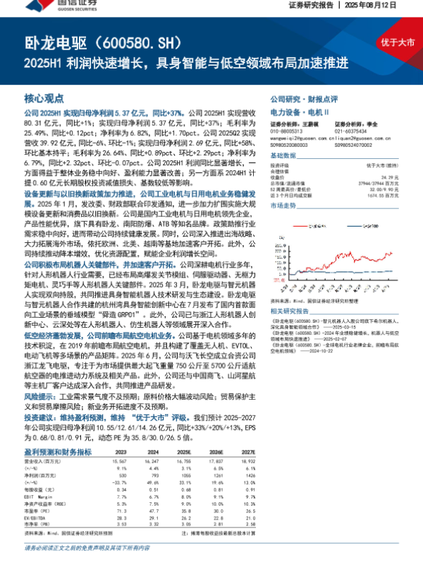 卧龙电驱 利润增长 低空经济 电机行业 具身智能