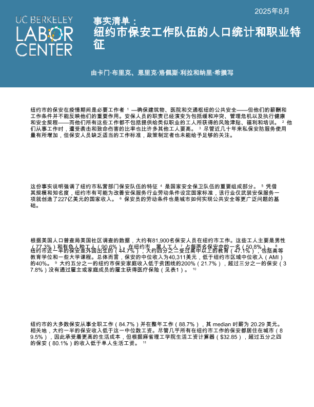 【加州大学伯克利分校劳工研究与教育中心】【202508】纽约市保安人员的人口统计和工作特征-8页