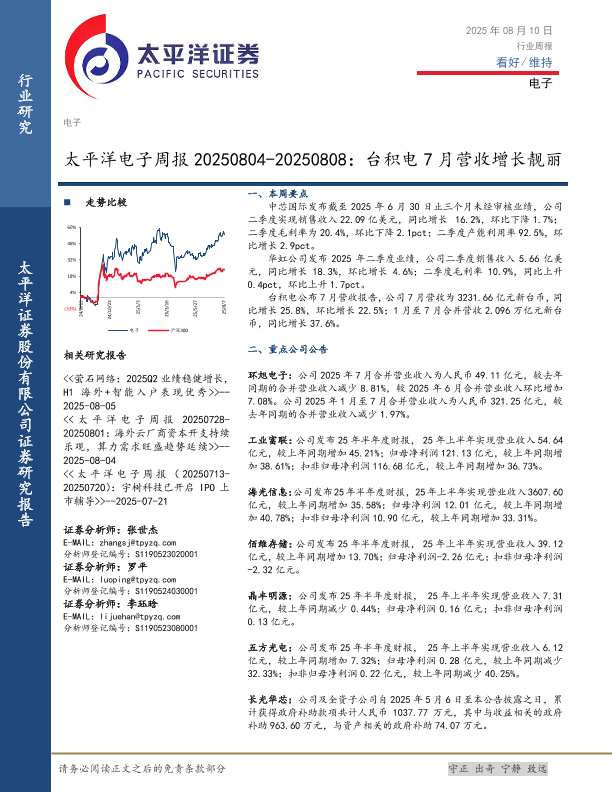 【太平洋证券】【20250810】太平洋证券-电子行业周报:台积电7月营收增长靓丽-9页