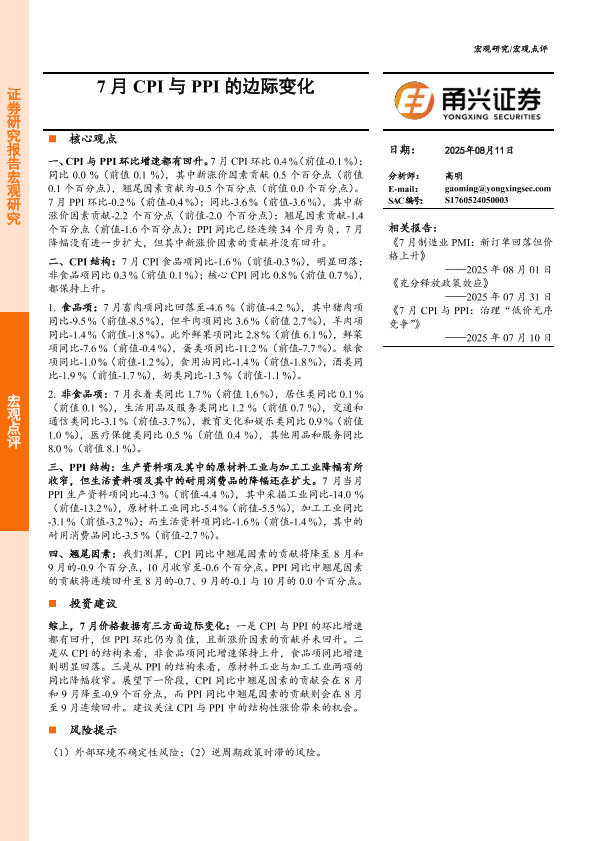 【甬兴证券】【20250811】7月CPI与PPI的边际变化-8页