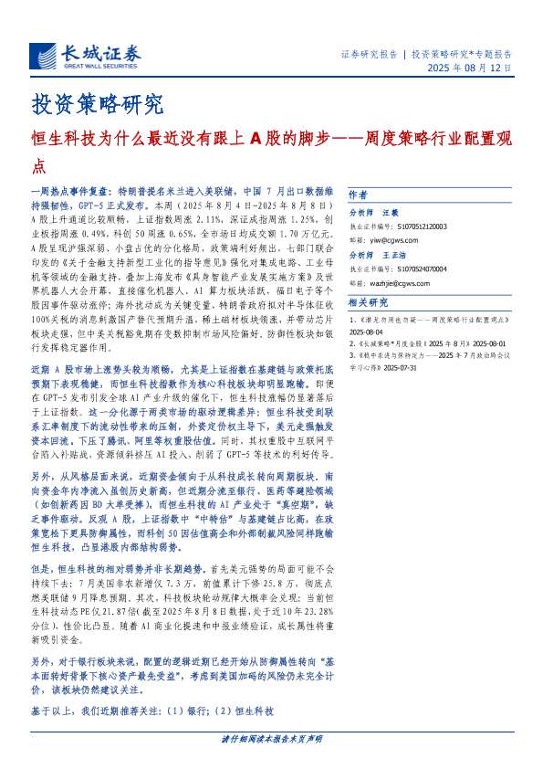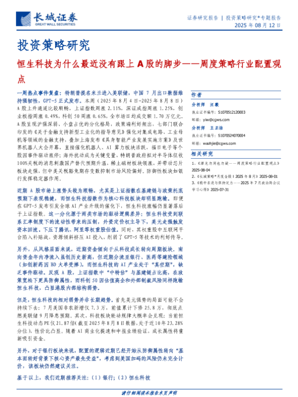 【长城证券】【20250812】投资策略研究:周度策略行业配置观点,恒生科技为什么最近没有跟上A股的脚步-8页