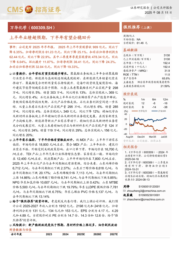 投资评级 下半年展望 化工行业 万华化学 业绩分析