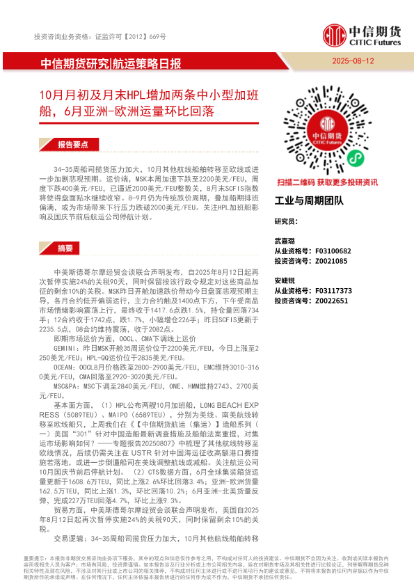 【中信期货】【20250812】航运策略日报:10月月初及月末HPL增加两条中小型加班船,6月亚洲~欧洲运量环比回落-8页