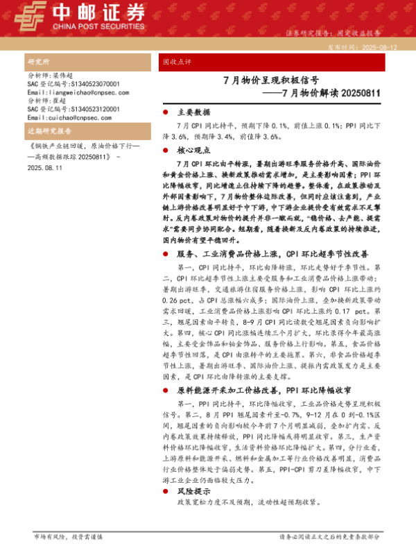 【中邮证券】【20250812】7月物价解读:7月物价呈现积极信号-15页