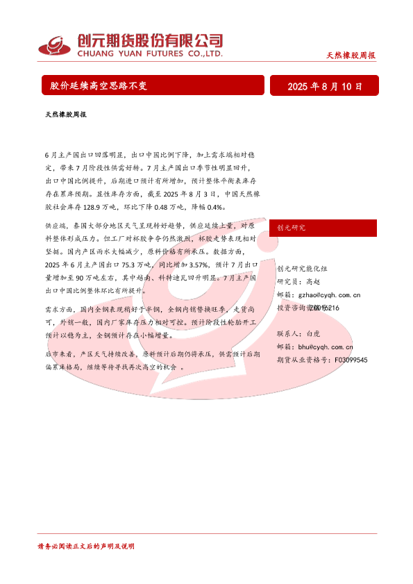 【创元期货】【20250810】创元期货-天然橡胶周报:胶价延续高空思路不变-19页