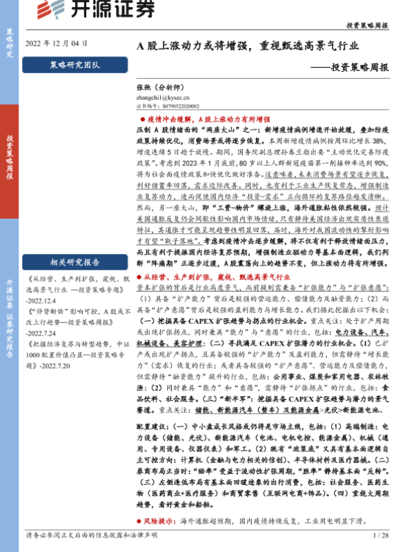 【开源证券】【20221204】投资策略周报:A股上涨动力或将增强,重视甄选高景气行业-28页