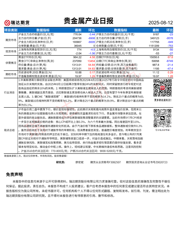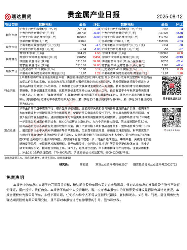 【瑞达期货】【20250812】贵金属产业日报-1页