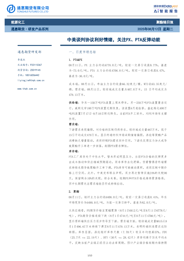 【通惠期货】【20230812】通惠期货-聚酯链日报:中美谈判协议利好情绪,关注PX、PTA反弹动能-10页