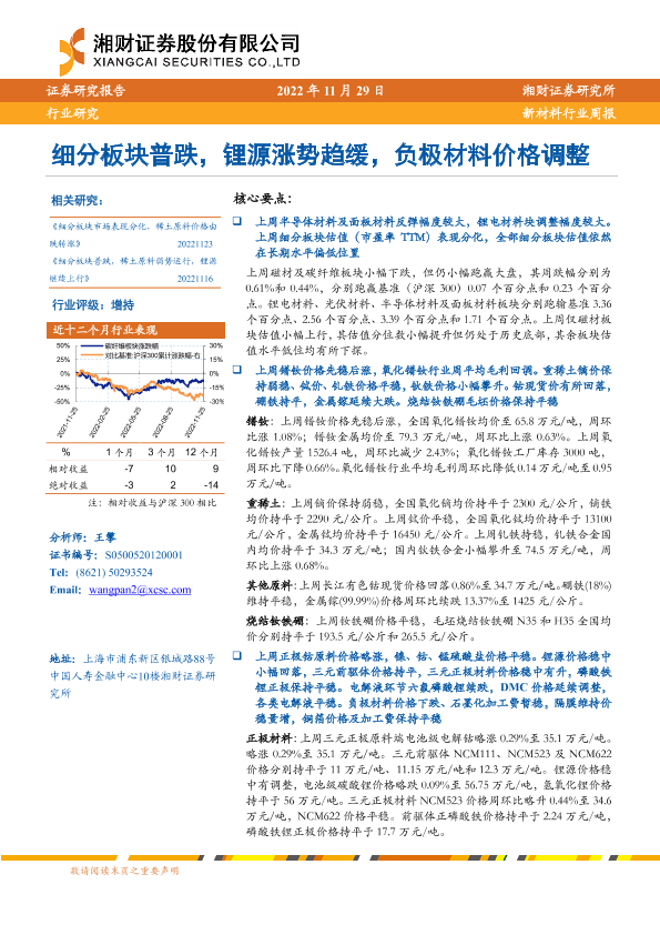 【湘财证券】【20221229】新材料行业周报:细分板块普跌,锂源涨势趋缓,负极材料价格调整-16页