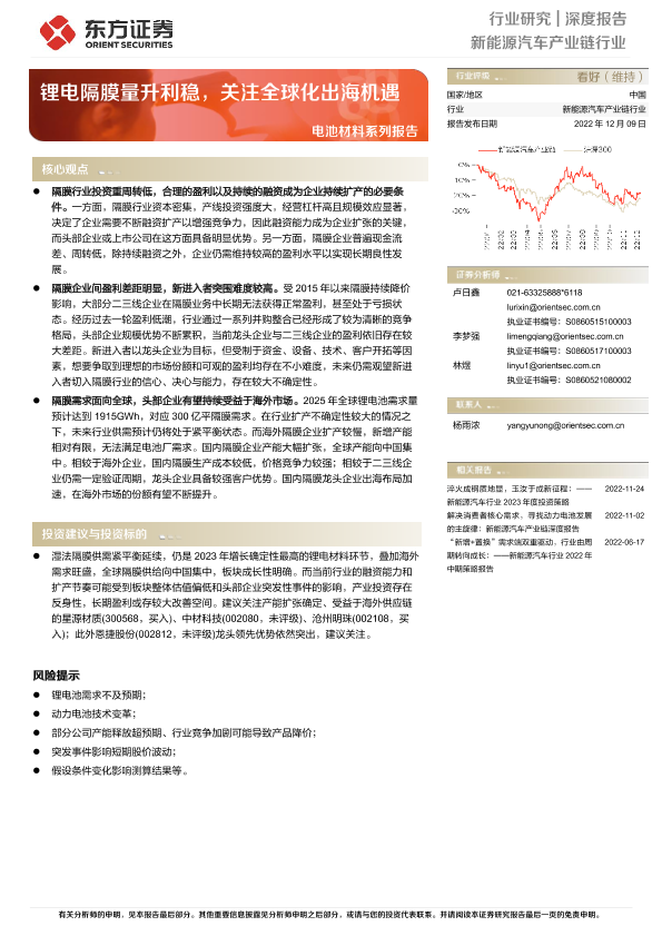 【东方证券】【20221209】新能源汽车产业链行业电池材料系列报告:锂电隔膜量升利稳,关注全球化出海机遇-18页