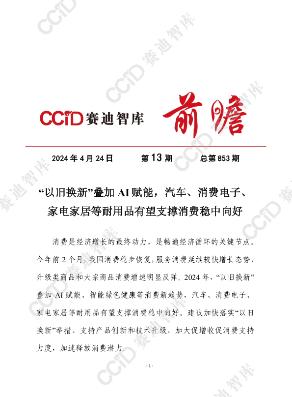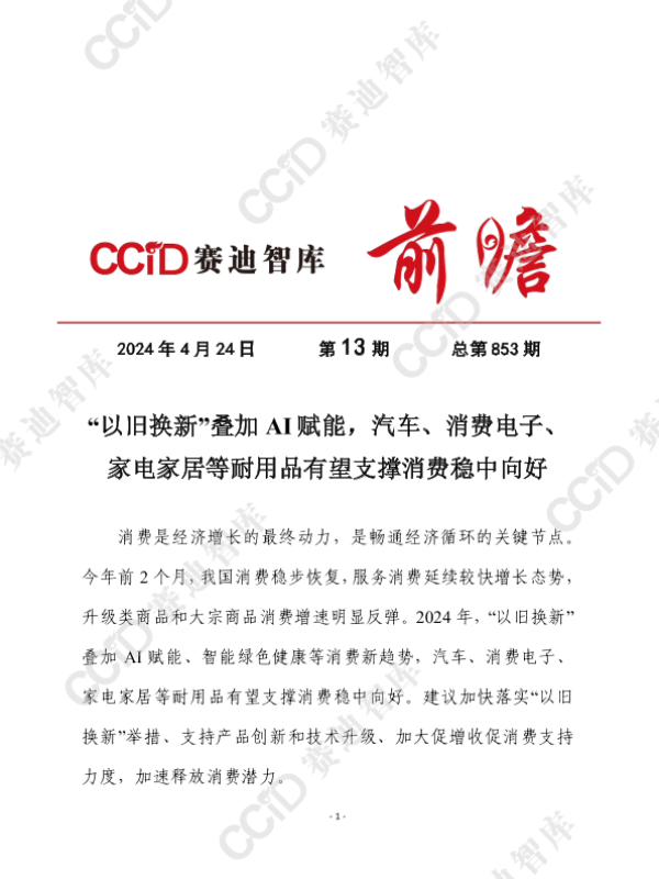 【出品方未明确提及】【20240424】“以旧换新”叠加AI赋能,汽车、消费电子、家电家居等耐用品有望支撑消费稳中向好-10页