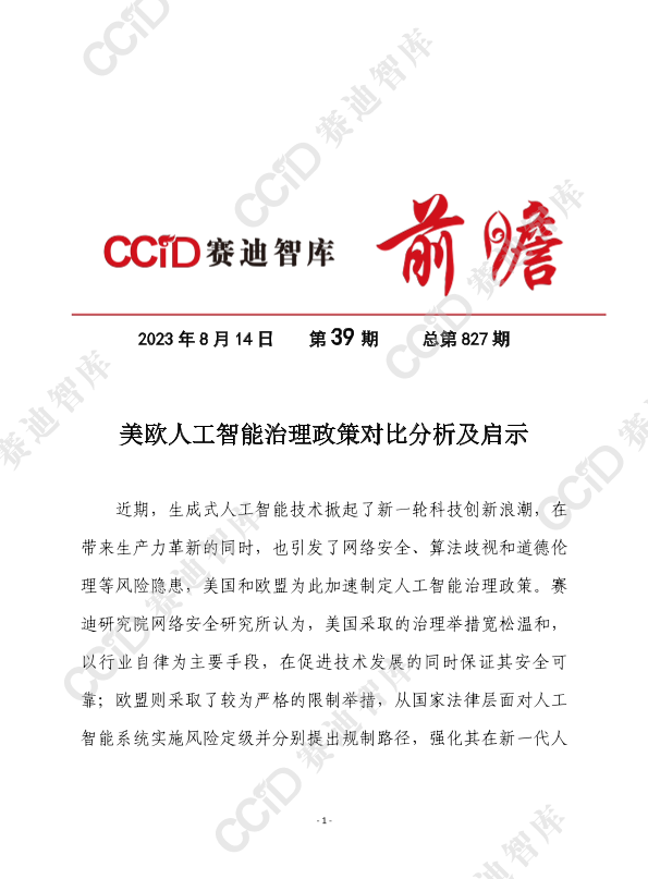 【赛迪研究院网络安全研究所】【20230814】美欧人工智能治理政策对比分析及启示-11页