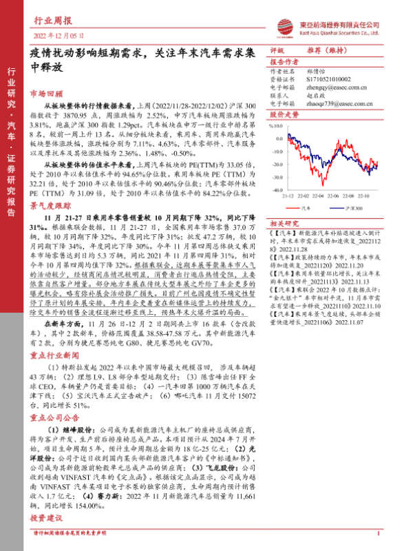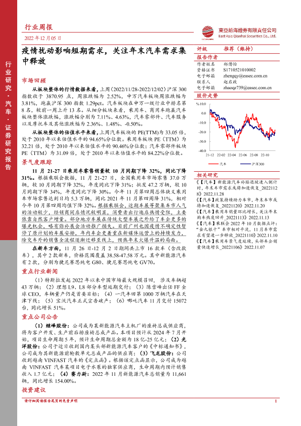 【东亚前海证券】【20221205】汽车行业周报:疫情扰动影响短期需求,关注年末汽车需求集中释放-19页