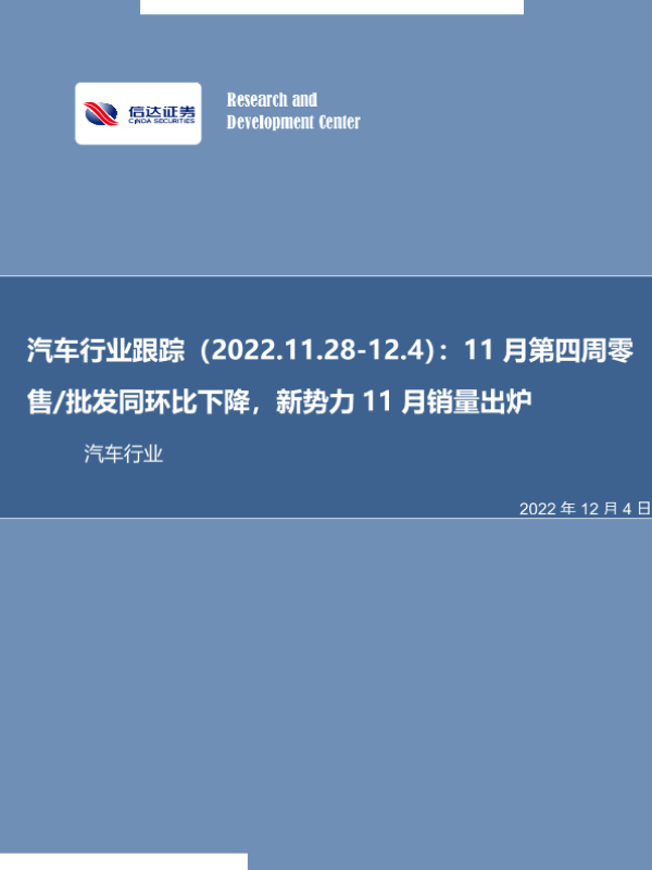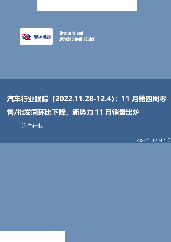 【信达证券】【20221204】汽车行业跟踪(2022.11.28-12.4):11月第四周零售批发同环比下降,新势力11月销量出炉-19页