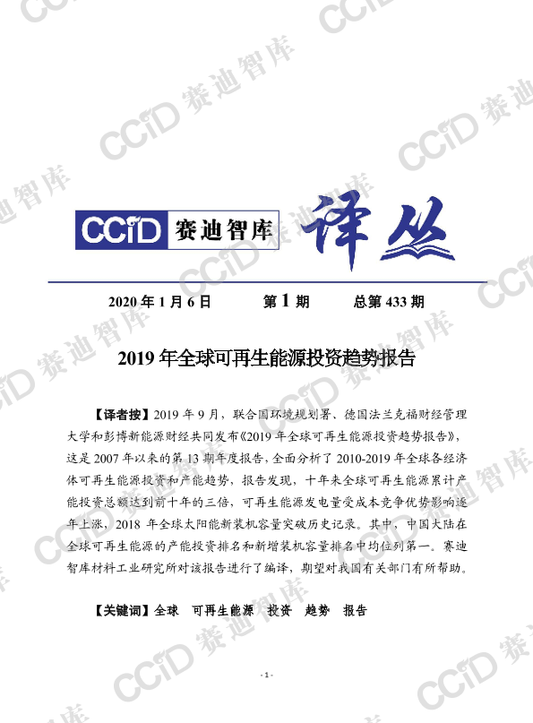 【联合国环境规划署&德国法兰克福财经管理大学&彭博新能源财经】【2019】2019年全球可再生能源投资趋势报告-23页