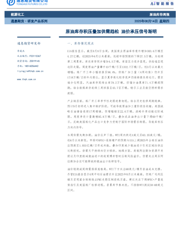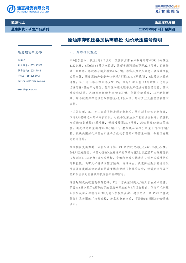 【通惠期货】【20250814】原油库存周报_原油库存积压叠加供需趋松_油价承压信号渐明-10页