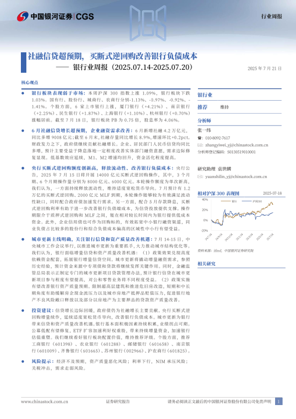 【银河证券】【20250721】银行业周报:社融信贷超预期,买断式逆回购改善银行负债成本-20页