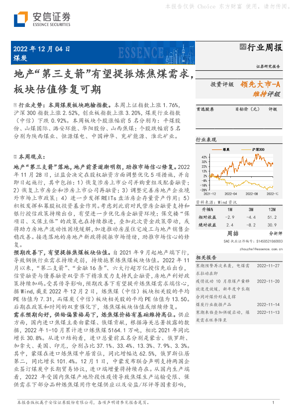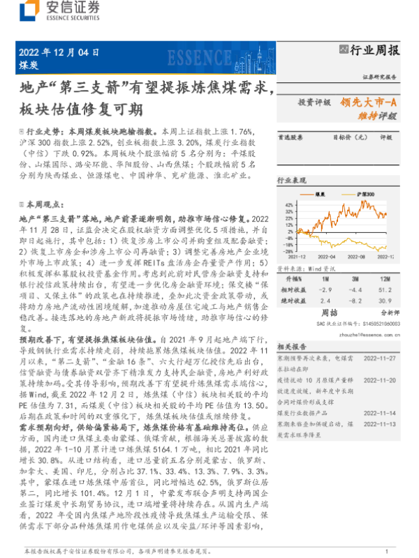 【安信证券】【20221204】煤炭行业周报:地产“第三支箭”有望提振炼焦煤需求,板块估值修复可期-17页