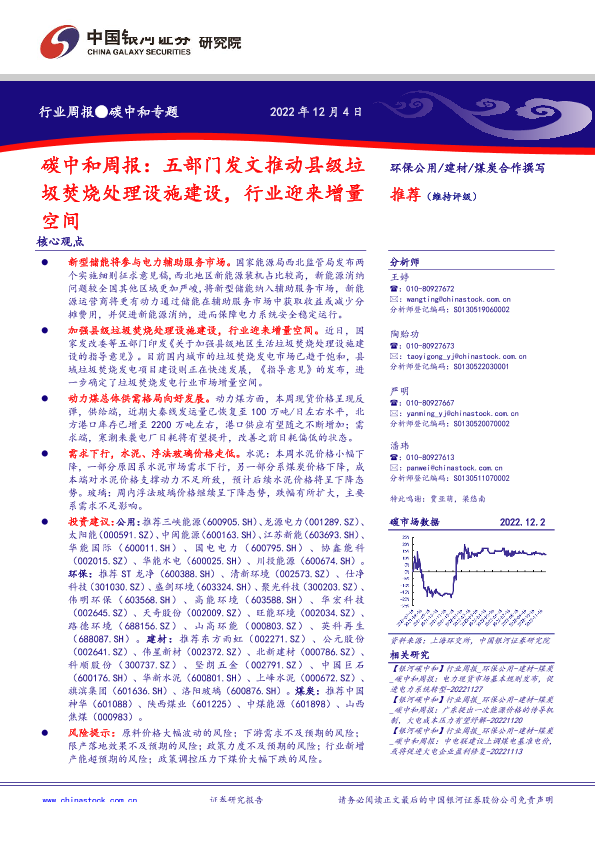 【银河证券】【20221204】环保公用建材煤炭行业碳中和周报:五部门发文推动县级垃圾焚烧处理设施建设,行业迎来增量空间-19页