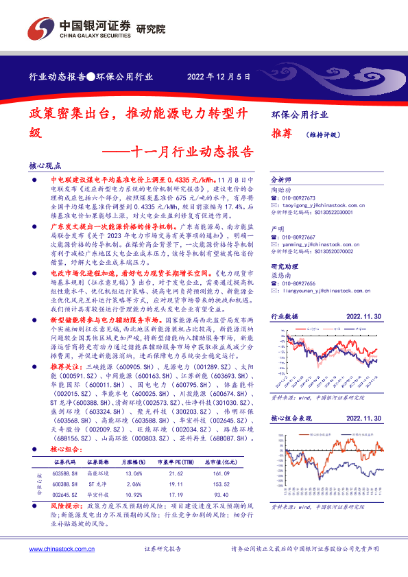 【银河证券】【20221205】环保公用行业十一月行业动态报告:政策密集出台,推动能源电力转型升级-18页