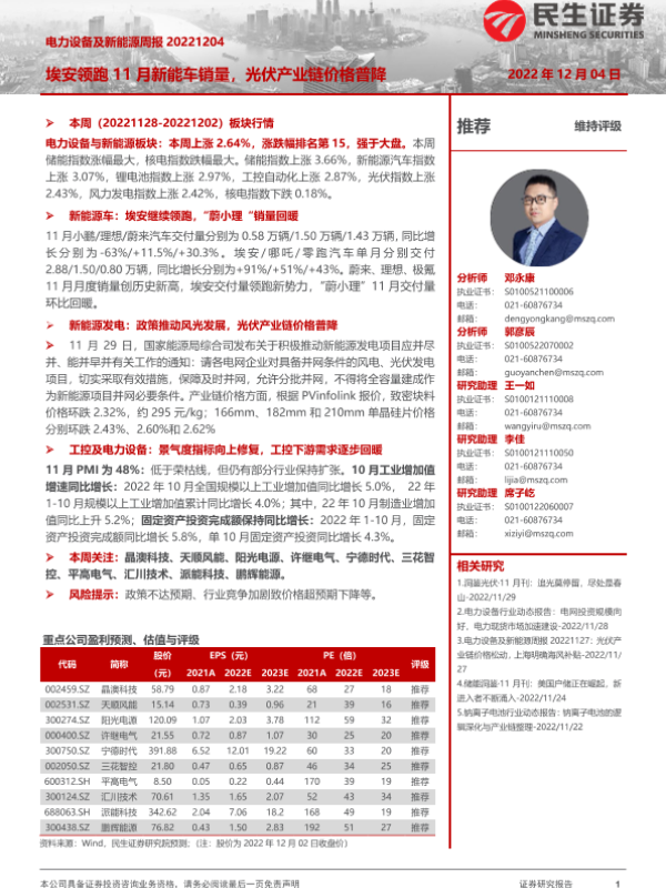 【民生证券】【20221204】电力设备及新能源周报:埃安领跑11月新能车销量,光伏产业链价格普降-28页