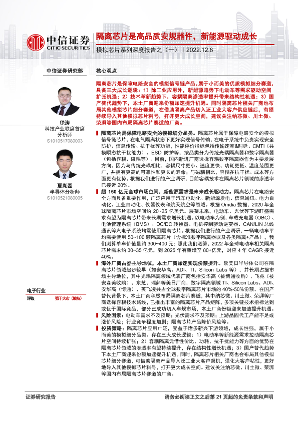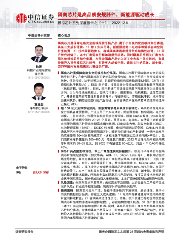 【中信证券】【20221206】电子行业模拟芯片系列深度报告之(一):隔离芯片是高品质安规器件,新能源驱动成长-22页