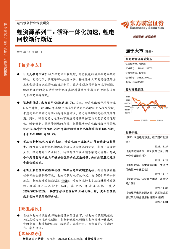 【东方财富证券】【20221207】电气设备行业深度研究:锂资源系列三:循环一体化加速,锂电回收渐行渐近-26页