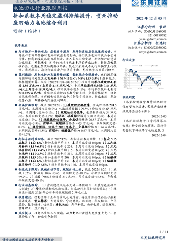 【东吴证券】【20221205】电池回收行业跟踪周报:折扣系数本周稳定盈利持续提升,贵州推动废旧动力电池综合利用-14页