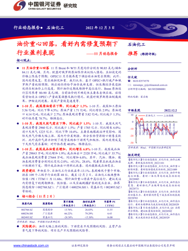 【银河证券】【20221203】石油化工11月动态报告:油价重心回落,看好内需修复预期下行业盈利表现-25页