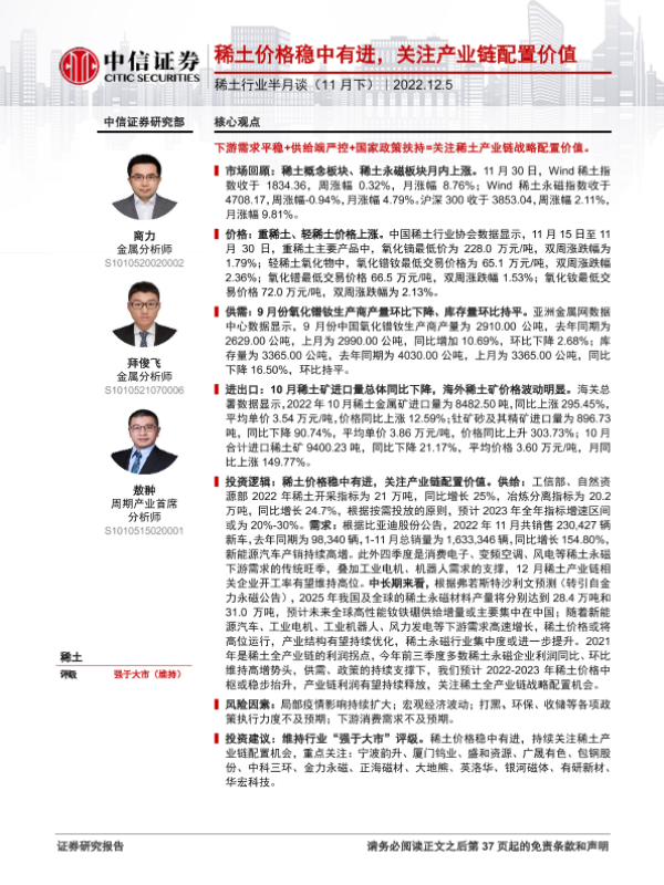 【中信证券】【20221205】稀土行业半月谈(11月下):稀土价格稳中有进,关注产业链配置价值-38页