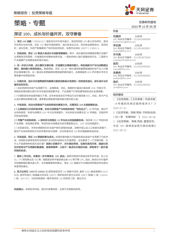 【天风证券】【20221205】策略·专题:深证100,成长与价值并济,攻守兼备-17页