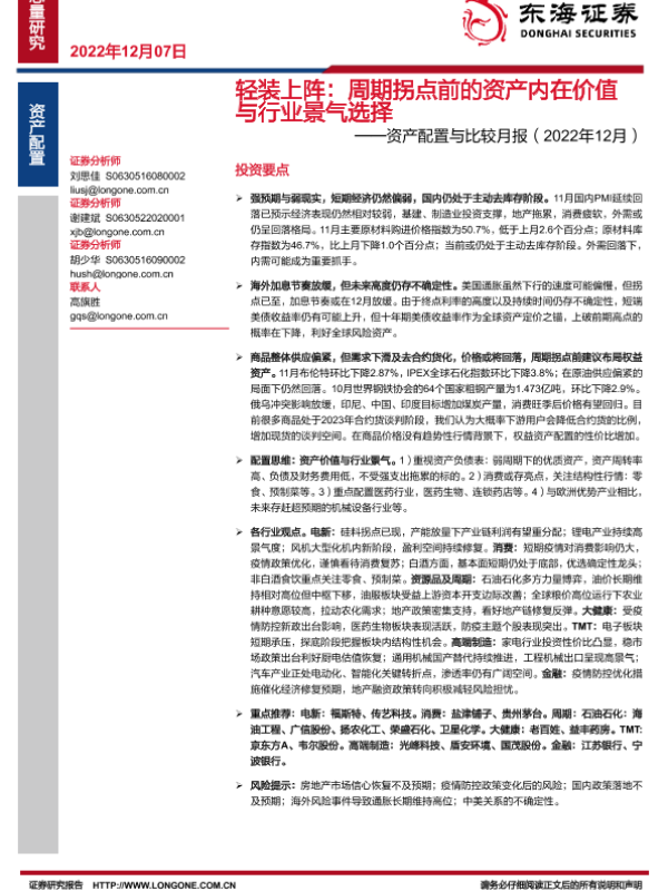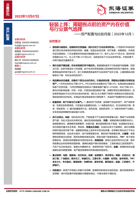 【东海证券】【20221207】轻装上阵:周期拐点前的资产内在价值与行业景气选择——资产配置与比较月报(2022年12月)-41页