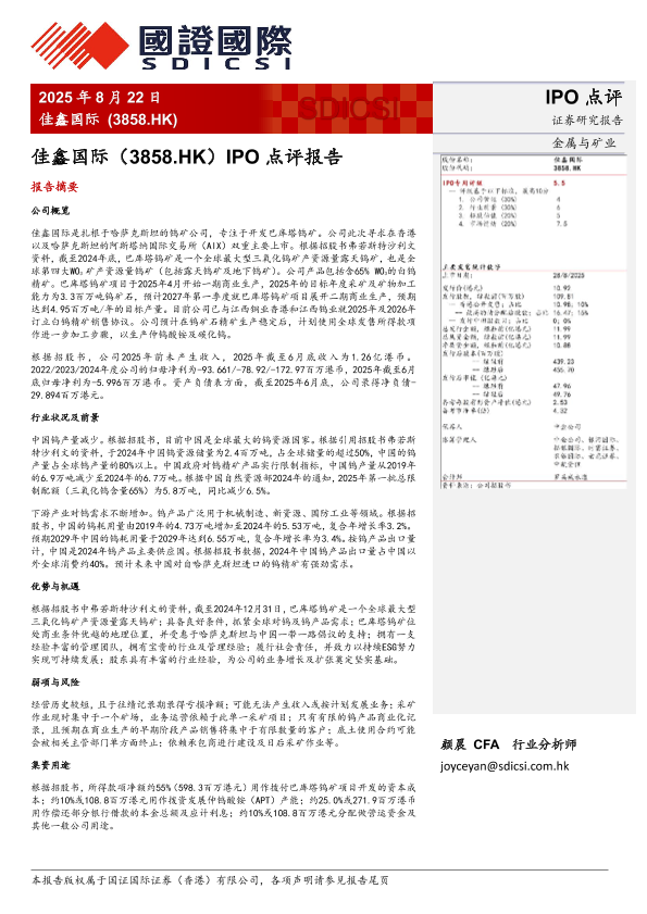 IPO 佳鑫国际 巴库塔钨矿 钨矿 香港上市