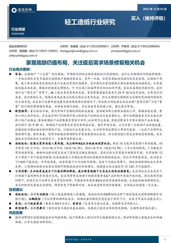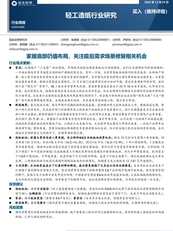 【国金证券】【20221203】轻工造纸行业研究:家居底部仍值布局,关注疫后需求场景修复相关机会-18页