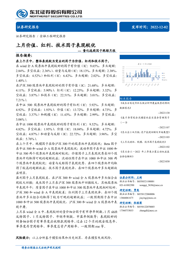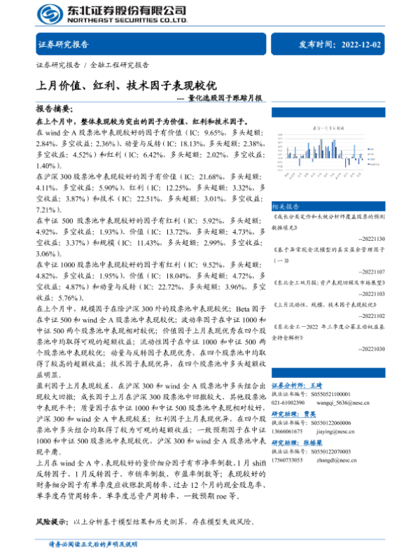 【东北证券】【20221202】量化选股因子跟踪月报:上月价值、红利、技术因子表现较优-40页