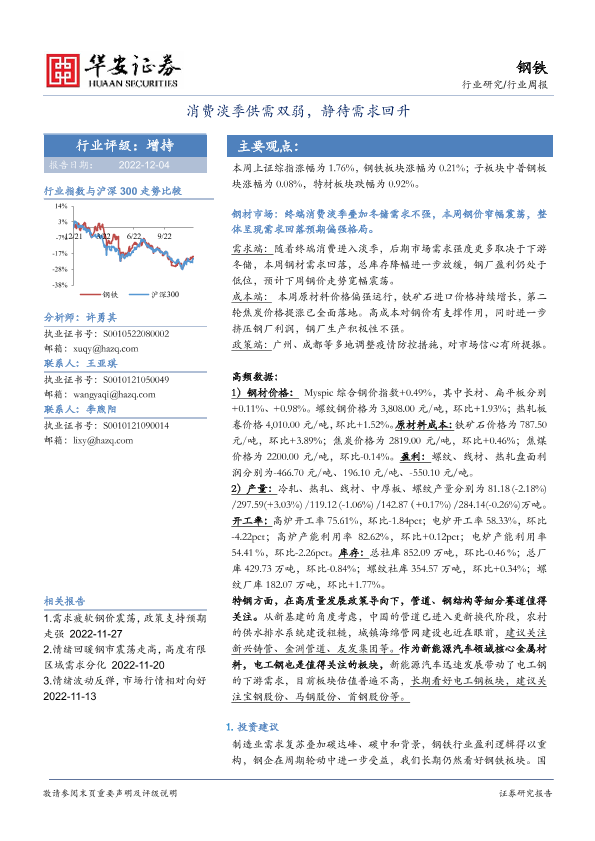 【华安证券】【20221204】钢铁行业周报:消费淡季供需双弱,静待需求回升-14页