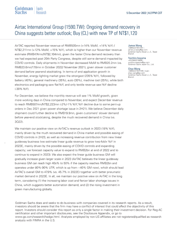 【Goldman Sachs】【20221205】Ongoing demand recovery in China suggests better outlook; Buy (CL) with new TP of NT$1,120-9页